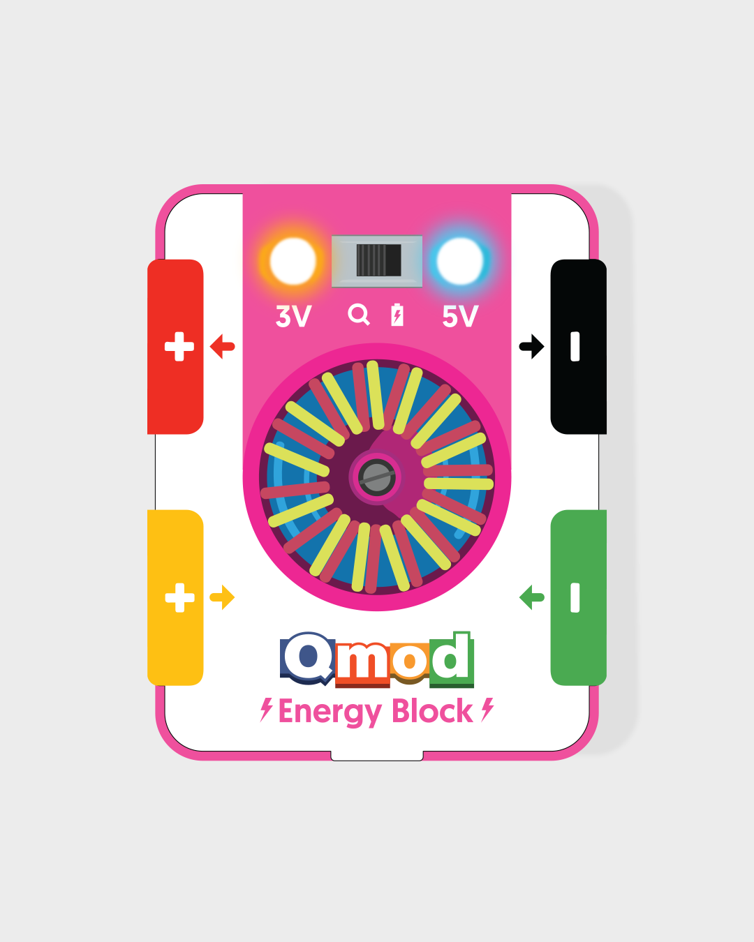 The Qmod Energy Block, an interactive battery specially developed to harness energy from natural sources including wind, water, sunshine even plants. Once fully charged the Qmod Energy Block is capable of delivering up to 5 Volts of sustainable energy, enough to power your own sustainable city.